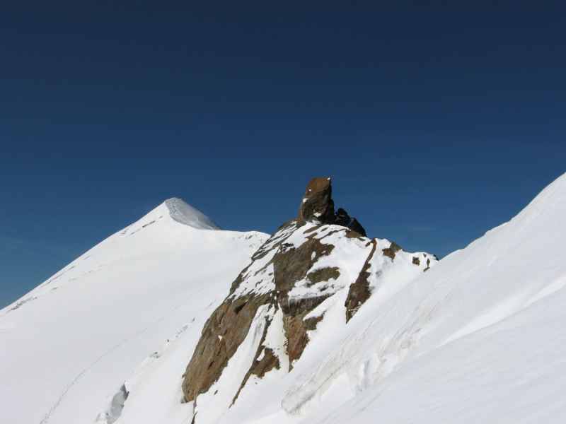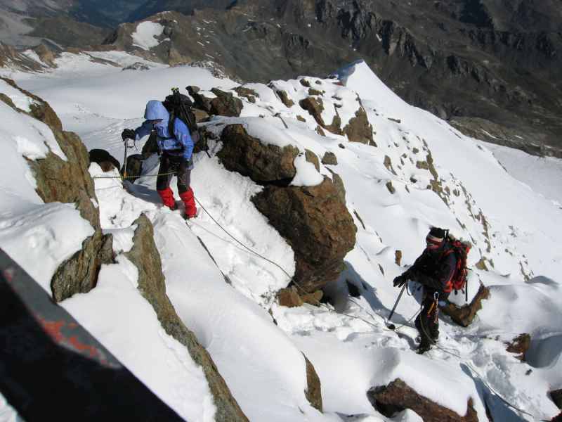 Am oberen Grat angekommen schlägt Hubert zu unserer aller Verwunderung den Weg zur südlichen Zufallspitze ein. Na gut, dann besteigen wir den Cevedale halt nicht. Wir waren ja schließlich fast oben – aber eben nicht ganz. Nun geht es erst wieder ein Stück hinab um dann den Gegenanstieg zum Gipfel der südlichen Zufallspitze zu beginnen. Hubert schlägt wieder Stufen ins Eis. Den Grund hierfür erfahren wir später beim Abstieg. Denn wenn die Stufen im Aufstieg auch kaum helfen, so gelangen wir im Abstieg jedoch umso sicherer und zügiger wieder hinab. Der Wind weht heftig in dieser Höhe. Ständig wehen und kleine Eispartikel ins Gesicht. Um zum felsigen Gipfel zu gelangen müssen wir die letzten Meter mit Steigeisen im 2. Klettergrat zurücklegen.