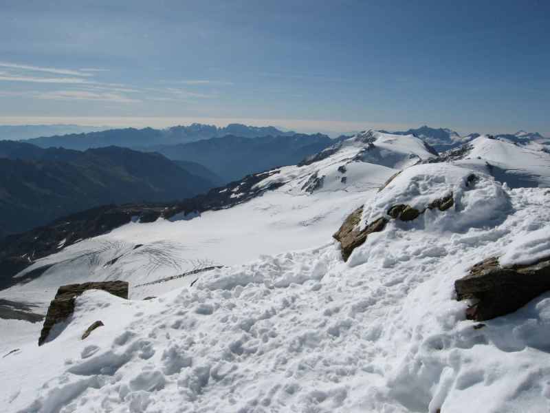 Entgegen unserer Vermutung, die Zufallspitze nun in direktem Weg in Richtung der „3 Kanonen“ zu verlassen, führt uns Hubert über unsere deutliche Spur hinüber zum Monte Cevedale. Also doch. Hubert wollte nur dem morgendlichen Gedränge auf dem Gipfel entgehen. So haben wir den Gipfel fast für uns alleine. Wir legen die Rucksäcke ab und genießen die großartige Rundumsicht mit Blicken auf Ortler und Königsspitze nach Nord-Westen und den hohen Gletscherbergen im Süden und Süd-Osten. Hier oben stellen wir fest, dass Heidrun ihre Gletscherbrille auf der Casati-Hütte zugesetzt hat. Der Aufenthalt in dieser Höhe mitten im Gletschergebiet kann böse Folgen für die Augen haben. Kurzerhand werden wir alle ab sofort im 10 Minuten-Rhythmus unsere Gletscherbrille an Heidrun weiterreichen.