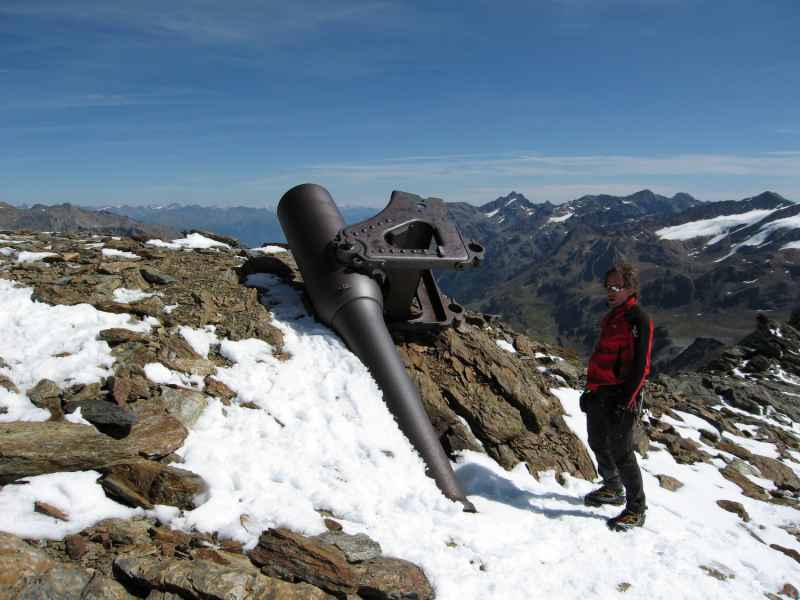 Nachdem wir uns auf der Casatihütte ein wenig gestärkt haben, erklimmen wir noch den Hausberg der Casati-Hütte, die Suldenspitze. Die Suldenspitze ist 3.376 Meter hoch und bietet einen schönen Blick auf Sulden bis hin zum Reschensee und auf unseren morgigen Weg – dem Aufstieg zum Monte Cevedale. Auch hier oben finden sich die Reste ehemaliger Verteidigungsstellungen aus dem Bergkrieg. Eine alte Lafette aus Stahl statt hölzernes Gipfelkreuz – na gut! Hubert erläutert uns die Namen der uns umgebenden Gipfel und Gletscher und gibt sich große Mühe. Wenn ich doch nur ein Bruchteil davon behalten könnte.