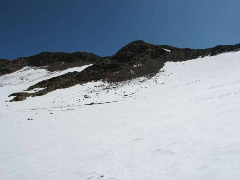 Nun gehen wir über den Kamm in Richtung Westen um den Sommerweg als Rückweg zu nutzen und damit einen leichteren Weg auf den Gletscher zurück zu finden. Am Gletscher legen wir wieder die Steigeisen an und machen uns dann auf den Rückweg.