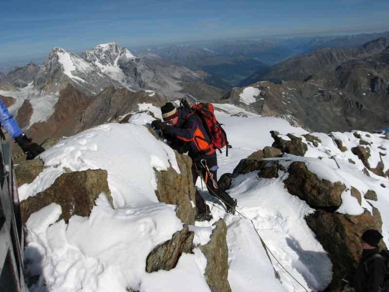 Unser Weg führt uns in moderater Steigung über den Gletscher. Vorbei an beeindruckenden Gletscherspalten mit Blicken bis tief hinab in den Gletscher. Wir sind nicht die einzige Seilschaft an diesem Tag. Mit der zunehmenden Sonne streben wir dem Monte Cevedale entgegen. Der Monte Cevedale gilt als höchster Skitourenberg der Ortlergruppe, weil er bei guten Verhältnissen mit Ski bis zum Gipfel bestiegen werden kann. Die Aufstiege sind nur mäßig schwierig, führen jedoch alle über Gletscher und erfordern Vorsicht vor Gletscherspalten und entsprechende Ausrüstung. Bevor wir den steilen Anstieg in Angriff nehmen machen wir eine kurze Trinkpause. Die ersten Seilschaften sind schon oben am Gipfelgrat angekommen. Im kalten Schatten des Cevedale steigen wir in einer schmalen Spur sehr konzentriert dem Gipfel entgegen. Eine kleine Unachtsamkeit kann hier fatale Folgen haben, denn der Gletscher fällt zur Rechten im Winkel von 45 Grad ab. In diesem steilen Abschnitt gilt es nun eine große Randkluft zu übersteigen. Zur Sicherheit schlägt Hubert einige sichere Stufen in das Eis auf denen wir und die nachfolgenden Seilschaften uns sicher bewegen können.
